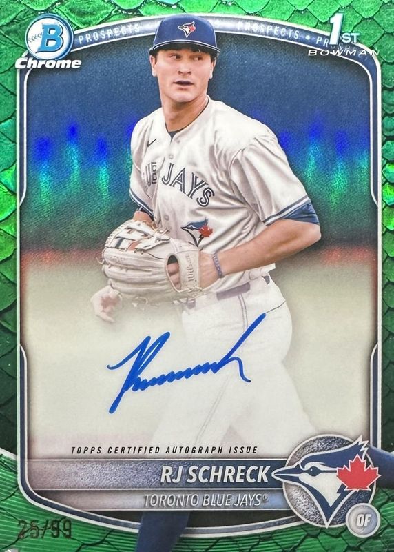 2025 Bowman Chrome RJ Schreck 1st Auto Green Reptilian Refractor /99 Blue Jays