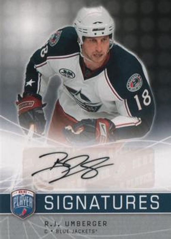 The RJ Umberger 2008 Upper Deck Be a Player #S-RU Signatures card is 1 of 4 RJ Umberger's card variations in the 2008 Upper Deck Be a Player set being tracked by Sports Card Investor, including Base /99, Player's Club /15, and Signatures Player's Club /15.