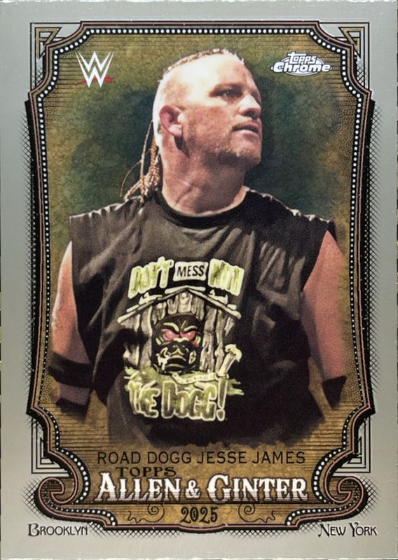 The Road Dogg 2025 Topps Chrome WWE #AG-RDJ Allen & Ginter card is 1 of 19 Road Dogg's card variations in the 2025 Topps Chrome WWE set being tracked by Sports Card Investor, including Allen & Ginter - Refractor, Marks of Champions Autographs, Marks of Champions Autographs - Refractor /175, Allen & Ginter - Blue Refractor /150, and Marks of Champions Autographs - Blue Refractor /150.