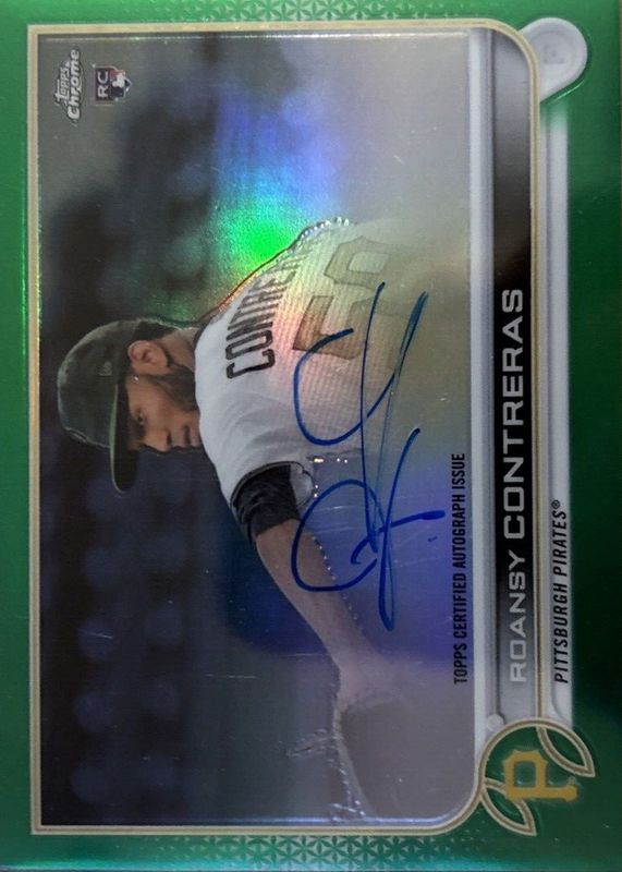 The Roansy Contreras 2022 Topps Chrome #RA-RCO Rookie Auto - Green Refractor /99 card in Raw condition has not changed in price in the last 30 days and was last sold for $3.50 .