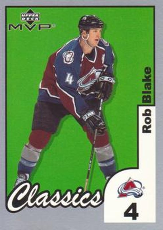 The Rob Blake 2002 Upper Deck MVP #47 Classics card is 1 of 5 Rob Blake's card variations in the 2002 Upper Deck MVP set being tracked by Sports Card Investor, including Base, Gold /100, Golden Classics /50, and Souvenirs Jerseys.