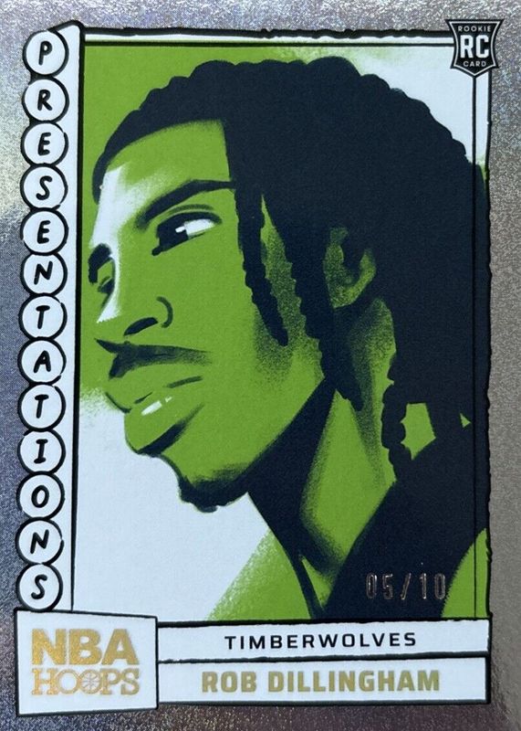 The Rob Dillingham 2024 Hoops #16 Presentations - Gold /10 Rookie card in Raw condition has not changed in price in the last 30 days and was last sold for $171.46 .