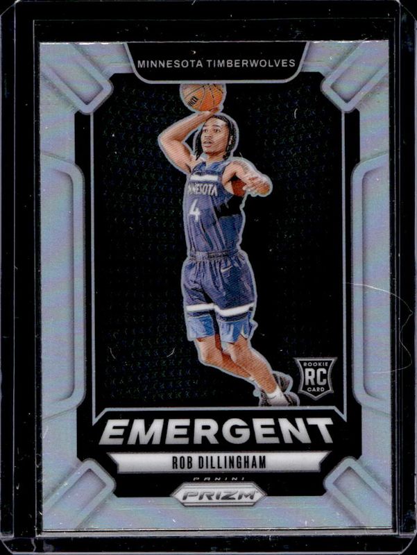 The Rob Dillingham 2024 Prizm #24 Emergent - Silver Rookie card is 1 of 124 Rob Dillingham's card variations in the 2024 Prizm set being tracked by Sports Card Investor, including Base, China Variation, Choice Blue Yellow Green, Fast Break, and Green.