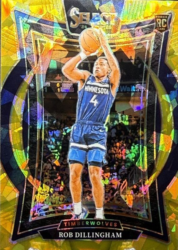 The Rob Dillingham 2024 Select #84 Concourse Gold Cracked Ice /10 Rookie card in Raw condition has not changed in price in the last 30 days and was last sold for $114.52 .