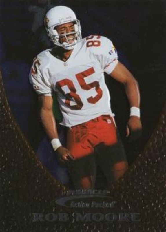 The Rob Moore 1997 Action Packed Flagship #69 First Impressions card is 1 of 6 Rob Moore's card variations in the 1997 Action Packed Flagship set being tracked by Sports Card Investor, including Base, Gold Impressions, Extra Points 10, Extra Points 100, and Extra Points Metal Die Prizes /1.