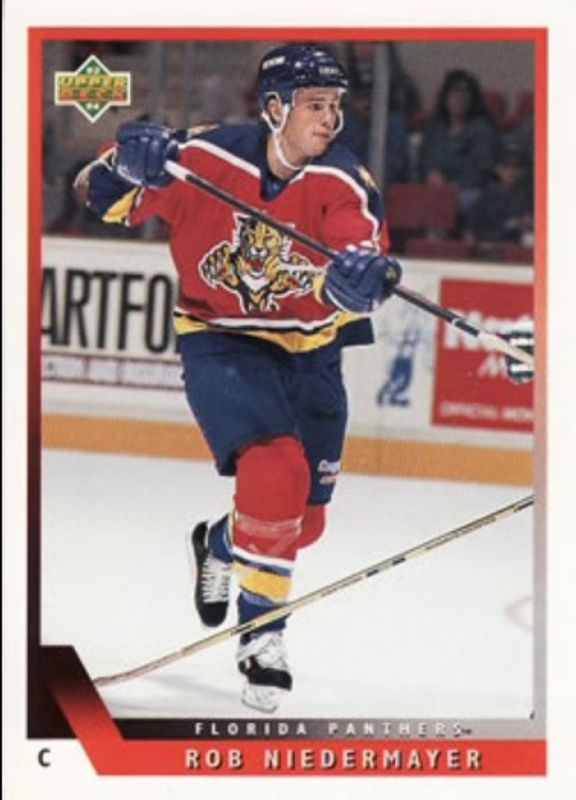 The Rob Niedermayer 1993 Upper Deck #98 Base card is 1 of 4 Rob Niedermayer's card variations in the 1993 Upper Deck set being tracked by Sports Card Investor, including Program of Excellence, Silver Skates Silver (Hobby), and SP.