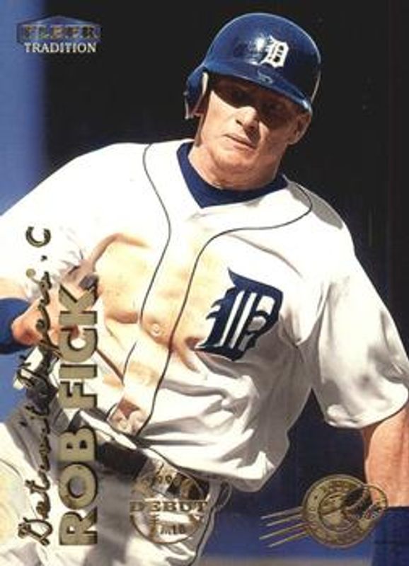 The Robert Fick 1999 Fleer Tradition #241 Millennium Rookie card is 1 of 4 Robert Fick's card variations in the 1999 Fleer Tradition set being tracked by Sports Card Investor, including Base, Warning Track Collection, and Starting 9 /9.