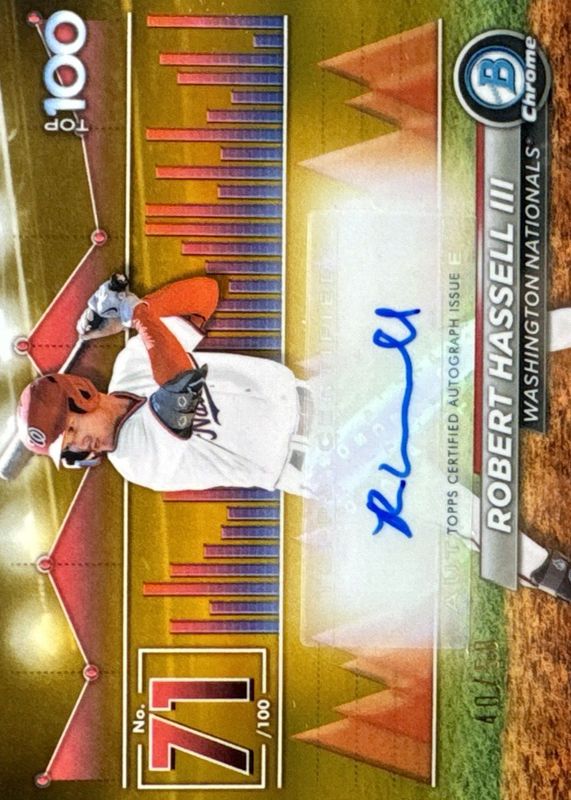 The Robert Hassell III 2024 Bowman #BTPA-71 Bowman Scouts' Top 100 Autographs - Gold Refractor /50 card in Raw condition has not changed in price in the last 30 days and was last sold for $9.99 .