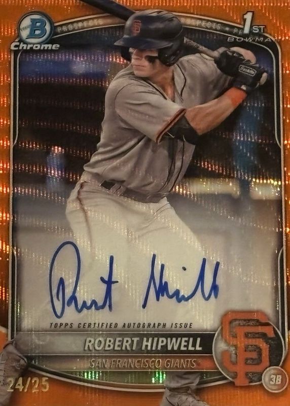 The Robert Hipwell 2025 Bowman Chrome #CPA-RH Prospect Auto - Orange Wave Refractor /25 (1st) card in Raw condition has not changed in price in the last 30 days and was last sold for $55.00 .