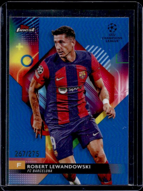 The Robert Lewandowski 2023 Topps Finest UEFA Club Competitions #109 Sky Blue /275 card is 1 of 30 Robert Lewandowski's card variations in the 2023 Topps Finest UEFA Club Competitions set being tracked by Sports Card Investor, including Base, Refractor, Purple /299, Blue Aqua Vapor Wave /250, and Purple Shimmer /199.