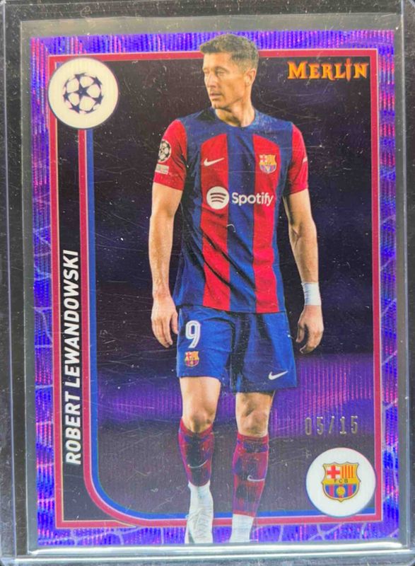 The Robert Lewandowski 2023 Topps Merlin Chrome UEFA Club Competitions #34 Purple Wave Refractor /15 card is 1 of 46 Robert Lewandowski's card variations in the 2023 Topps Merlin Chrome UEFA Club Competitions set being tracked by Sports Card Investor, including Base, Aqua Prism Refractor, Refractor, Vintage Merlin Refractor, and Neon Green Shimmer Refractor /399.