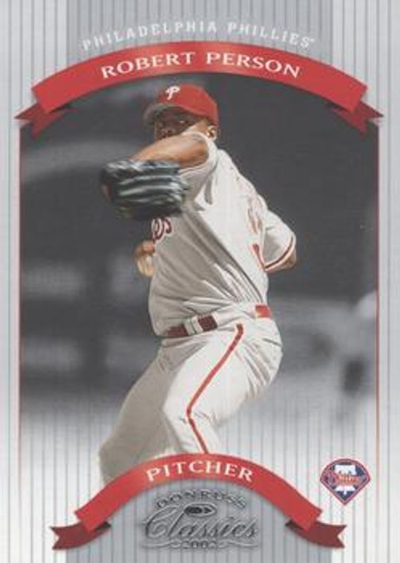 The Robert Person 2002 Donruss Classics #61 Samples - Silver card is 1 of 6 Robert Person's card variations in the 2002 Donruss Classics set being tracked by Sports Card Investor, including Base /1500, Samples - Gold, Timeless Tributes /100, Chicago National /5, and Significant Signatures /100.