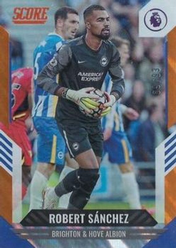 The Robert Sanchez 2021 Score Premier League #151 Orange Lava /99 card is 1 of 16 Robert Sanchez's card variations in the 2021 Score Premier League set being tracked by Sports Card Investor, including Base, Red Laser, Red Lava, Blue Laser /49, and Blue Lava /49.