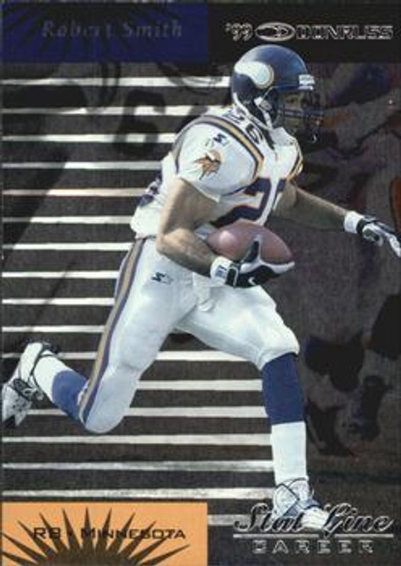 The Robert Smith 1999 Donruss #75 Stat Line Career /223 card is 1 of 3 Robert Smith's card variations in the 1999 Donruss set being tracked by Sports Card Investor, including Base, and Stat Line Season /14.