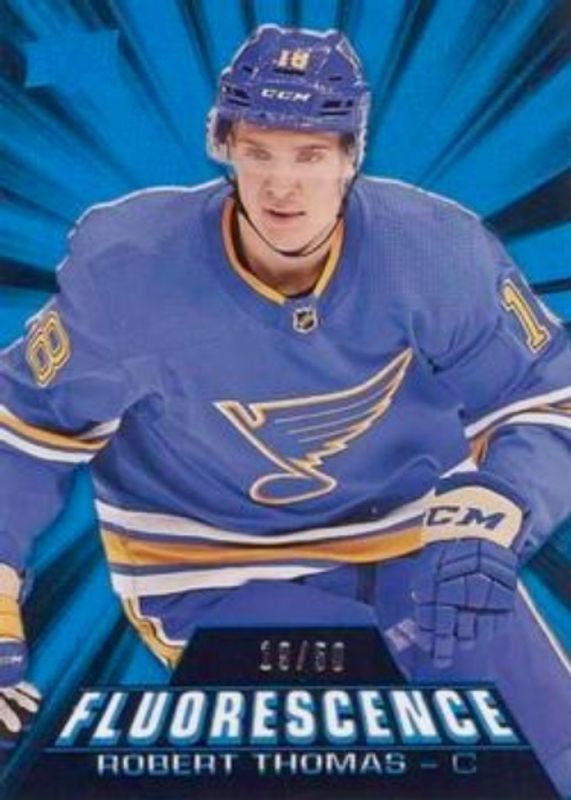 The Robert Thomas 2018 Upper Deck #F-33 Fluorescence - Blue /50 Rookie card is 1 of 31 Robert Thomas' card variations in the 2018 Upper Deck set being tracked by Sports Card Investor, including Young Guns Base, Young Guns Canvas, Young Guns - Clear Cut, Young Guns - Jumbo, and Young Guns - Silver Foil.