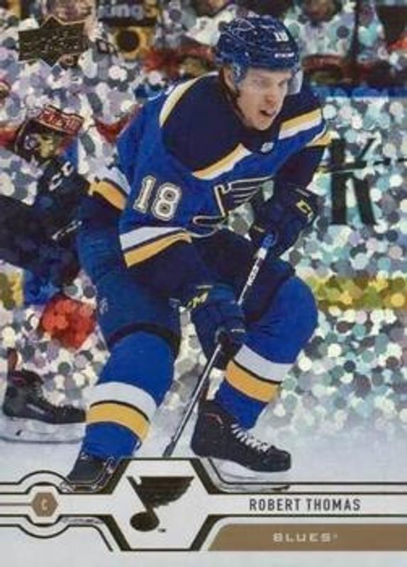 The Robert Thomas 2019 Upper Deck #120 Speckled Rainbow Foil card is 1 of 15 Robert Thomas' card variations in the 2019 Upper Deck set being tracked by Sports Card Investor, including Base, Clear Cut, UD Exclusives Clear Cut, UD Exclusives /100, and UD High Gloss /10.