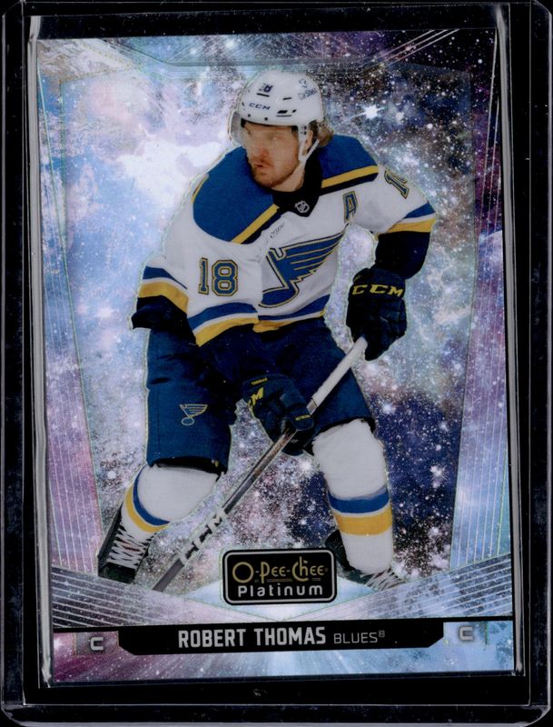 The Robert Thomas 2024 O-Pee-Chee Platinum #93 Cosmic /65 card is 1 of 15 Robert Thomas' card variations in the 2024 O-Pee-Chee Platinum set being tracked by Sports Card Investor, including Base, Neon Yellow Surge, Pink Magma, Rainbow, and Sunset.