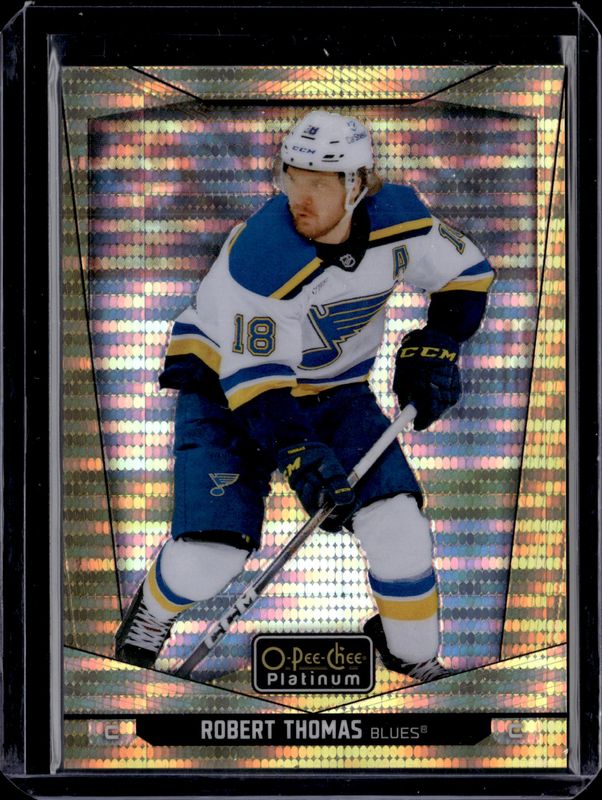 The Robert Thomas 2024 O-Pee-Chee Platinum #93 Seismic Gold /50 card is 1 of 15 Robert Thomas' card variations in the 2024 O-Pee-Chee Platinum set being tracked by Sports Card Investor, including Base, Neon Yellow Surge, Pink Magma, Rainbow, and Sunset.