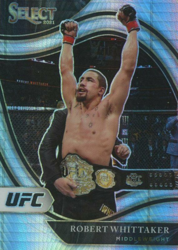 This card is 1 of 48 Robert Whittaker's card variations in the 2021 Select UFC set being tracked by Sports Card Investor, including Concourse Disco, Concourse Scope, Concourse Silver, Concourse Tri-Color, and Octagonside Disco.