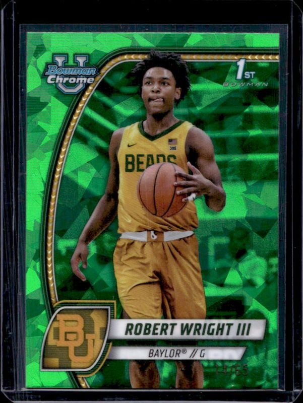 The Robert Wright III 2024 Bowman Chrome University Sapphire Edition #15 Green Refractor /65 card is 1 of 18 Robert Wright III's card variations in the 2024 Bowman Chrome University Sapphire Edition set being tracked by Sports Card Investor, including Base, Purple Refractor /100, Yellow Refractor /75, Gold Refractor /50, and Orange Refractor /25.