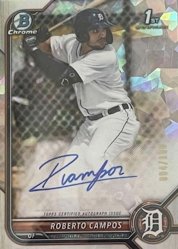 This card is 1 of 40 Roberto Campos' card variations in the 2022 Bowman set being tracked by Sports Card Investor, including Chrome Prospects (1st), Chrome Prospects - Refractor /499 (1st), Chrome Prospects - Lava Refractor /399 (1st), Chrome Prospects - Speckle Refractor /299 (1st), and Chrome Prospects - Purple RayWave Refractor /250 (1st).