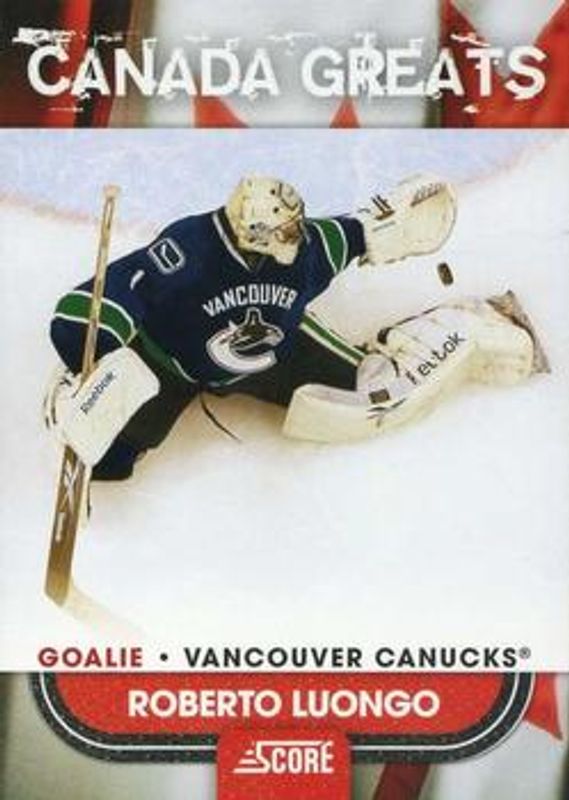 The Roberto Luongo 2010 Score #15 Canada Greats card is 1 of 10 Roberto Luongo's card variations in the 2010 Score set being tracked by Sports Card Investor, including #470 Base, #14 Base, #470 20th Anniversary, #14 20th Anniversary, and #470 French Back.