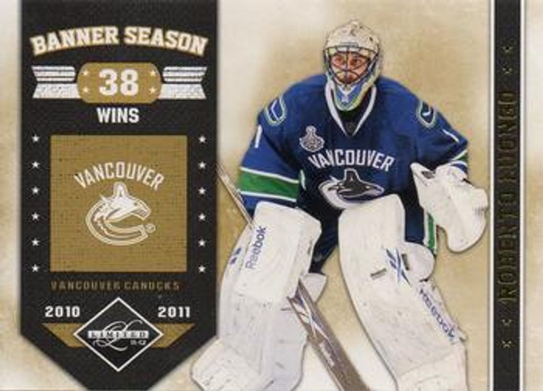 The Roberto Luongo 2011 Limited #10 Banner Season - Gold Spotlight /25 card is 1 of 21 Roberto Luongo's card variations in the 2011 Limited set being tracked by Sports Card Investor, including Base /299, Ruby Spotlight /49, Materials Prime /25, Monikers Gold /25, and Gold Spotlight /10.