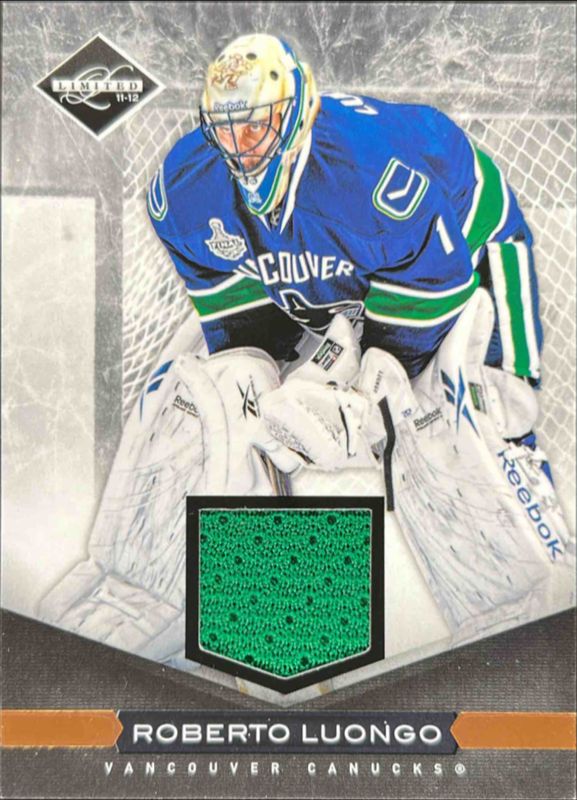 The Roberto Luongo 2011 Limited #176 Materials /10 card is 1 of 21 Roberto Luongo's card variations in the 2011 Limited set being tracked by Sports Card Investor, including Base /299, Ruby Spotlight /49, Materials Prime /25, Monikers Gold /25, and Gold Spotlight /10.