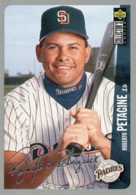 The Roberto Petagine 1996 Upper Deck Collector's Choice #297 Silver Signatures card is 1 of 3 Roberto Petagine's card variations in the 1996 Upper Deck Collector's Choice set being tracked by Sports Card Investor, including Base, and Gold Signatures.