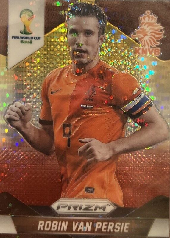 This card is 1 of 13 Robin van Persie's card variations in the 2014 Prizm World Cup set being tracked by Sports Card Investor, including Base, Blue & Red Wave, Red White Blue Power Plaid, Silver, and Blue /199.