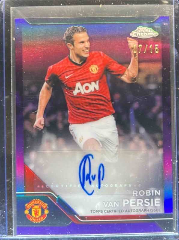 The Robin van Persie 2024 Topps Chrome Manchester United Deluxe #CA-VP Chrome Autographs - Purple Refractor /15 card is 1 of 22 Robin van Persie's card variations in the 2024 Topps Chrome Manchester United Deluxe set being tracked by Sports Card Investor, including Chrome Autographs, Old Trafford Ovation, Red Devil Relic, Chrome Autographs - Yellow Refractor /75, and Chrome Autographs - Gold Refractor /50.