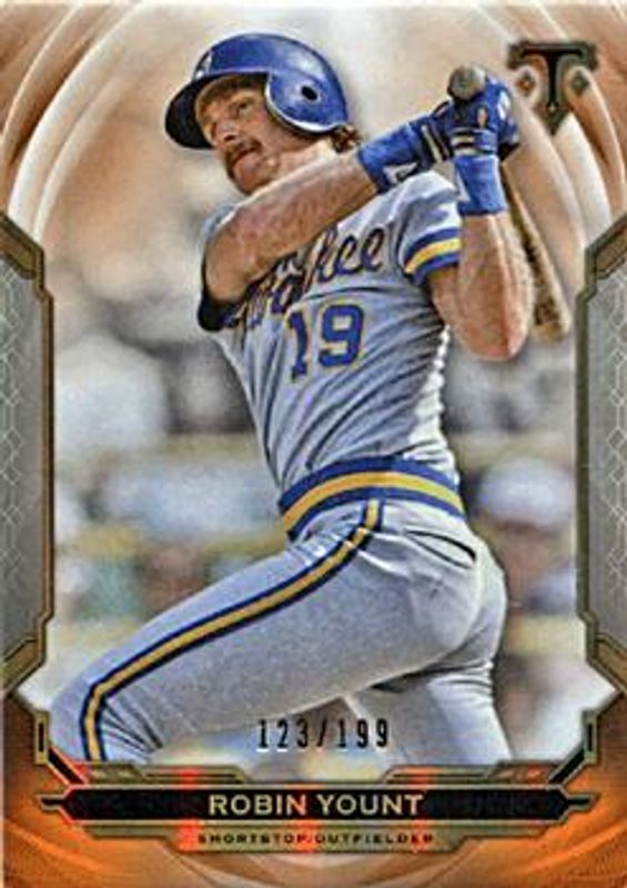 The Robin Yount 2019 Topps Triple Threads #30 Amber /199 card is 1 of 23 Robin Yount's card variations in the 2019 Topps Triple Threads set being tracked by Sports Card Investor, including Base, Amethyst /299, Emerald /259, Gold /99, and Citrine /75.