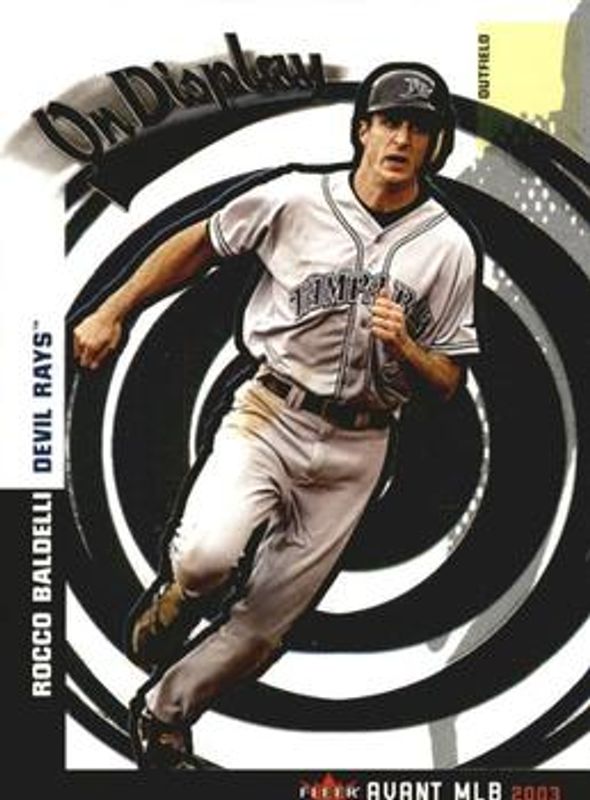 The Rocco Baldelli 2003 Fleer Avant #3-OD On Display /399 Rookie card is 1 of 9 Rocco Baldelli's card variations in the 2003 Fleer Avant set being tracked by Sports Card Investor, including Base /799, Black & White /199, Autographs - Blue /300, On Display - Game Used /250, and Autograph - Copper /150.