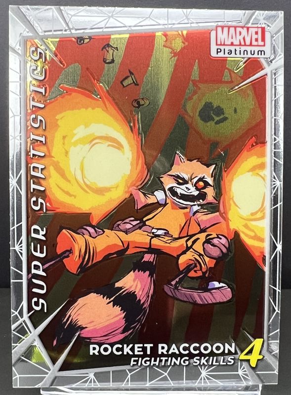 The Rocket Raccoon 2023 Upper Deck Marvel Platinum #PL07 Super Statistics card is 1 of 47 Rocket Raccoon's card variations in the 2023 Upper Deck Marvel Platinum set being tracked by Sports Card Investor, including Base, Black Rainbow, Blue Rainbow, Blue Surge, and Purple Rainbow.