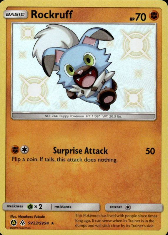 The Rockruff 2019 Sun & Moon: Hidden Fates #SV23/SV94 Shiny Rare card in Raw TCG (Lightly Played) condition has not changed in price in the last 30 days and was last sold for $3.99 .