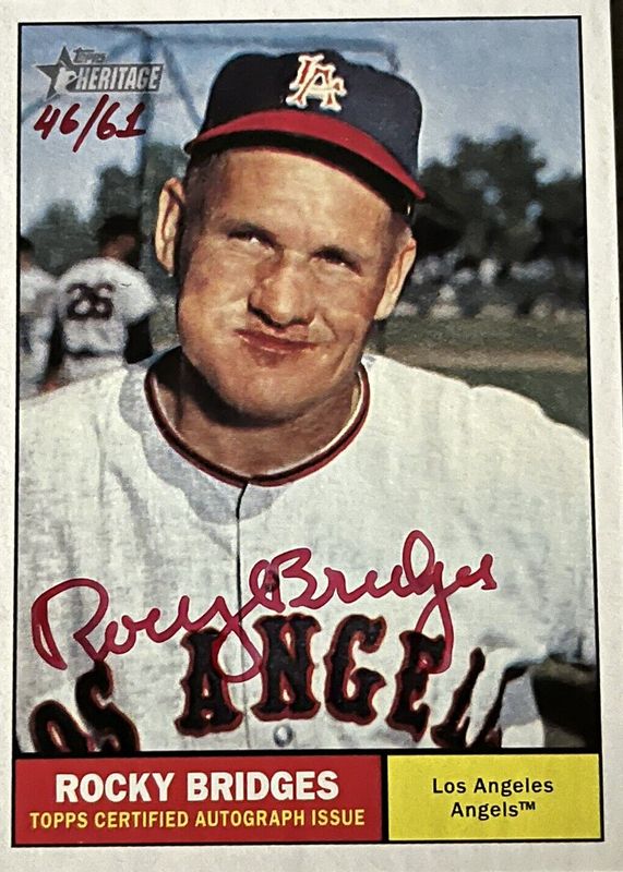 The Rocky Bridges 2010 Topps Heritage #ROA-RB Real One Autographs - Red Ink /61 card in Raw condition has not changed in price in the last 30 days and was last sold for $53.95 .