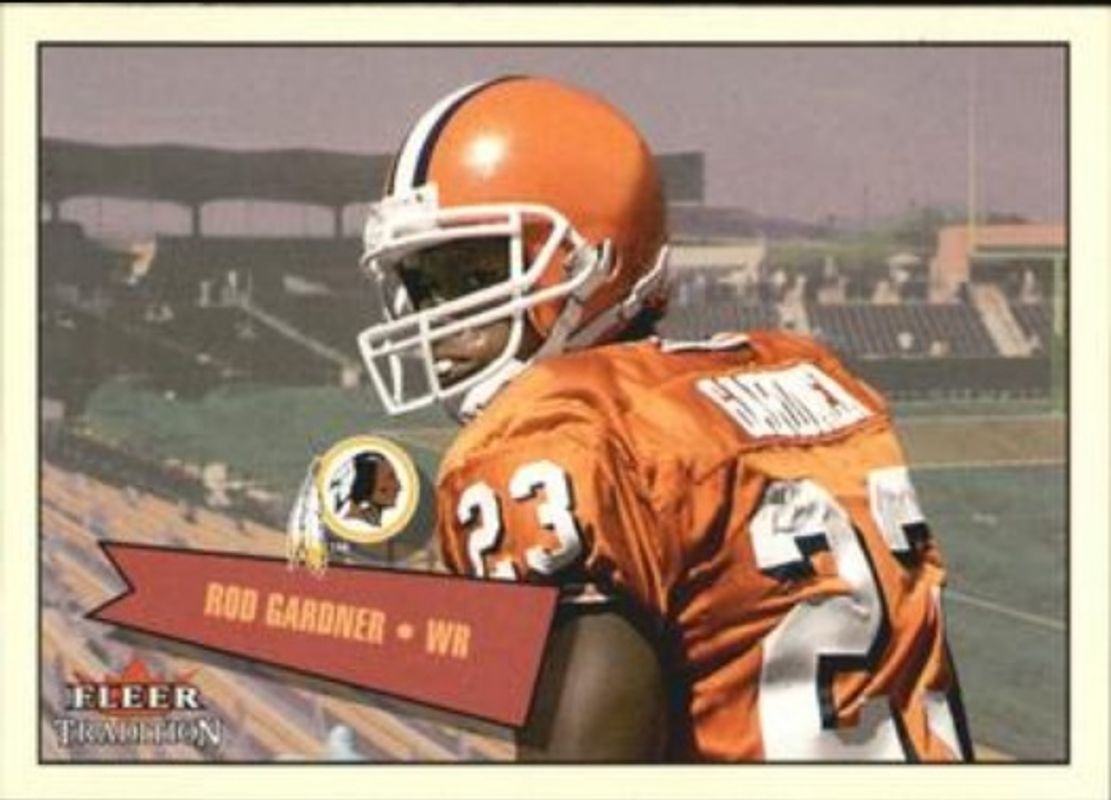 The Rod Gardner 2001 Fleer Tradition Glossy #410 Rookie Stickers /699 card is 1 of 3 Rod Gardner's card variations in the 2001 Fleer Tradition Glossy set being tracked by Sports Card Investor, including Base /2001, and Rookie Minis /350.