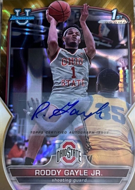 Auctions Ending Soon for Roddy Gayle Jr. 2022 Bowman Chrome University #8 Prospect Autographs - Gold Refractor /50 (1st) RAW