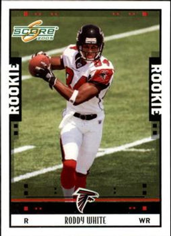 The Roddy White 2005 Score #354 Base Rookie card is 1 of 6 Roddy White's card variations in the 2005 Score set being tracked by Sports Card Investor, including Glossy, Scorecard /599, Adrenaline /399, Revolution /199, and Final Score /17.