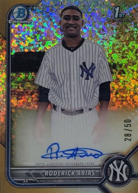 The Roderick Arias 2022 Bowman Chrome #CPA-RA Prospect Auto - Gold Mini-Diamond Refractor /50 (1st) card in Raw condition has not changed in price in the last 30 days and was last sold for $175.00 .