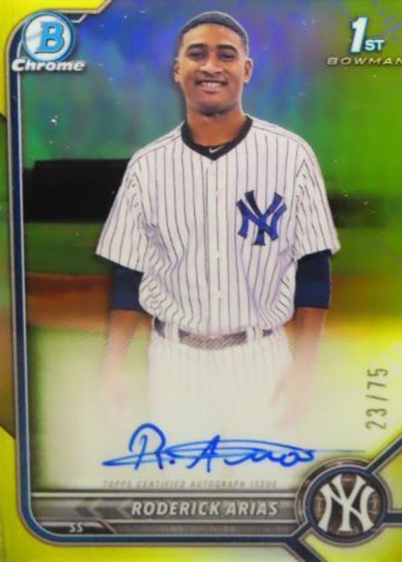 The Roderick Arias 2022 Bowman Chrome #CPA-RA Prospect Auto - Yellow Refractor /75 (1st) card in Raw condition has not changed in price in the last 30 days and was last sold for $144.29 .