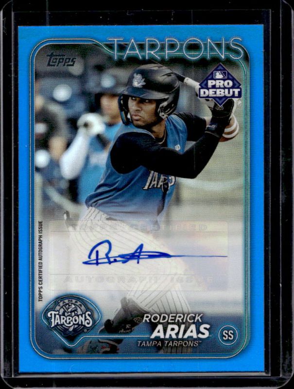 The Roderick Arias 2024 Topps Pro Debut #PD-80 Base Autographs - Blue /150 card is 1 of 31 Roderick Arias' card variations in the 2024 Topps Pro Debut set being tracked by Sports Card Investor, including Base, Fuchsia Foil /199, Sparkle Foil /175, Blue Foil /150, and Green Foil /99.