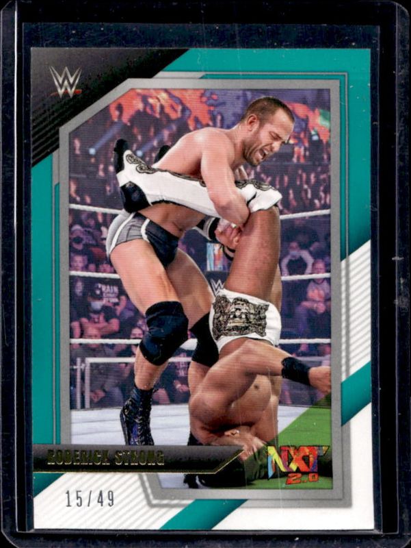 The Roderick Strong 2022 Panini WWE NXT #72 Teal /49 card is 1 of 44 Roderick Strong's card variations in the 2022 Panini WWE NXT set being tracked by Sports Card Investor, including Base, Green, Silver, Red /199, and Blue /149.