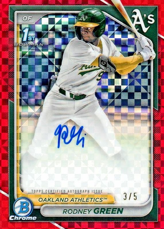 The Rodney Green 2024 Bowman Draft #CPA-RG Chrome DP Auto - Red X-Fractor /5 (1st) card in Raw condition has not changed in price in the last 30 days and was last sold for $190.50 .