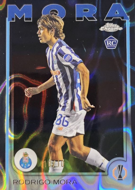 This card is 1 of 46 Rodrigo Mora's card variations in the 2024 Topps Chrome UEFA Club Competitions set being tracked by Sports Card Investor, including Base, Geometric Refractor, Hongbao Red Refractor, Magenta Shimmer Refractor, and Pulsar Refractor.