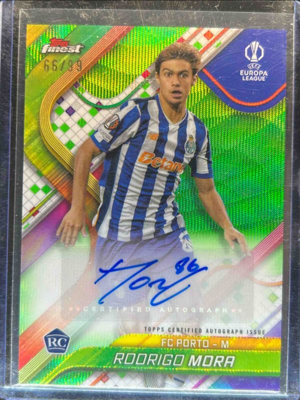 The Rodrigo Mora 2024 Topps Finest UEFA Club Competitions #BA-RM Base Autographs - Neon Green Wave Refractor /99 Rookie card is 1 of 52 Rodrigo Mora's card variations in the 2024 Topps Finest UEFA Club Competitions set being tracked by Sports Card Investor, including Base, Refractor, Purple Refractor /299, Sky Blue Refractor /275, and Pink RayWave Refractor /250.
