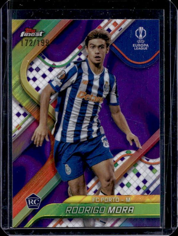 The Rodrigo Mora 2024 Topps Finest UEFA Club Competitions #80 Purple Lava Refractor /199 Rookie card is 1 of 52 Rodrigo Mora's card variations in the 2024 Topps Finest UEFA Club Competitions set being tracked by Sports Card Investor, including Base, Refractor, Purple Refractor /299, Sky Blue Refractor /275, and Pink RayWave Refractor /250.