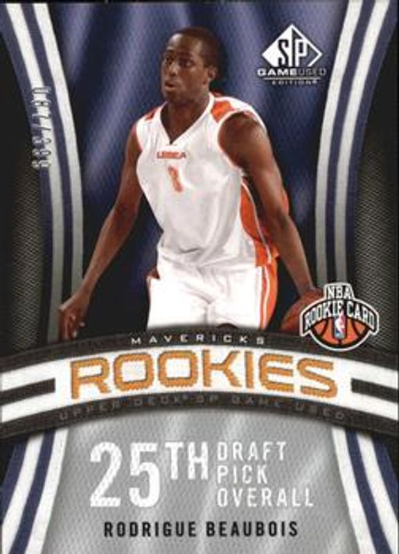 The Rodrigue Beaubois 2009 SP Game Used #107 Base /399 Rookie card is 1 of 3 Rodrigue Beaubois' card variations in the 2009 SP Game Used set being tracked by Sports Card Investor, including SP Rookie Signatures /5, and Rookie Exclusive Signatures /100.