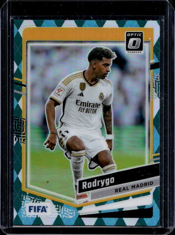 The Rodrygo 2023 Donruss #118 Optic - Argyle card is 1 of 53 Rodrygo's card variations in the 2023 Donruss set being tracked by Sports Card Investor, including Base, Optic, Cubic, Diamond, and Optic - Holo.
