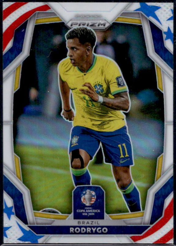 The Rodrygo 2024 Prizm Copa America #35 Stars & Stripes /24 card is 1 of 59 Rodrygo's card variations in the 2024 Prizm Copa America set being tracked by Sports Card Investor, including Base, Green Ice, Green Wave, Hyper, and Ice.